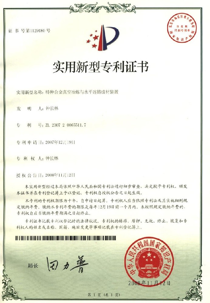 • 實用新型專利證書